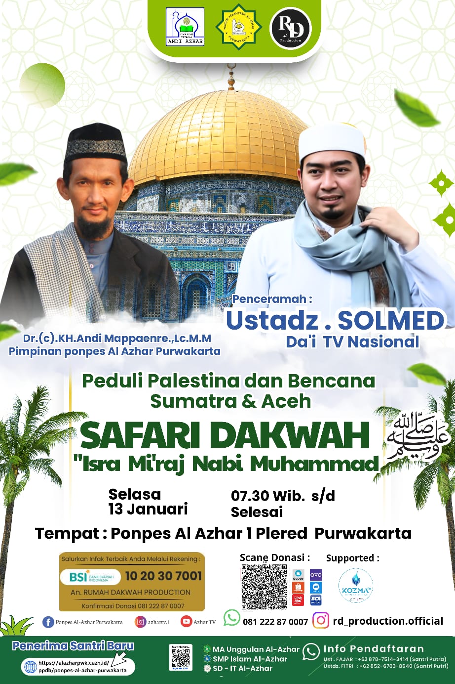 <p>SAFARI DAKWAH<br>ISRA MI'RAJ NABI MUHAMMAD<br>Penceramah : Ust Solmed ( Da'i Nasional)<br>Hari Selasa<br>Tgl 13 Januari 2026<br>Tempat : Halaman Ponpes Al-Azhar.<br>Jam 07.00 wib.<br>Siapkan infaq terbaik untuk Palestina dan Bencana Sumatera.<br>========================<br>Tahun Ajaran Baru, Juli 2026<br>Ponpes Al Azhar Menerima Santri Non Mondok ( Pulang Pergi untuk tingkat SD- SMP - MA )<br>Bantu sebarkan.</p>